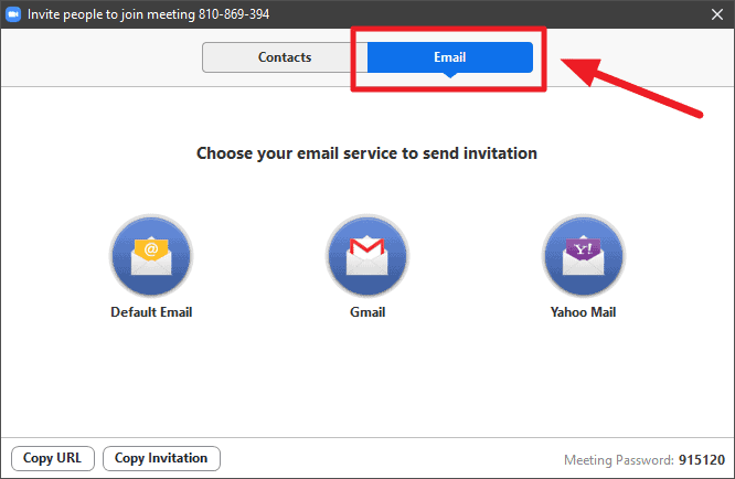 Step 2: If you have contacts saved in Zoom, you can select their names to send an invitation directly. If not, click on the 'Email' tab to send an invitation via email.