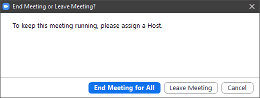 A prompt will appear giving you the choice to 'End Meeting for All' or 'Leave Meeting' if you wish to exit while allowing others to continue.
