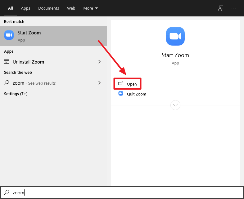If the Zoom Meetings window doesn't open automatically, you can find it by searching for 'Zoom' in the Start menu and selecting the 'Start Zoom' app.