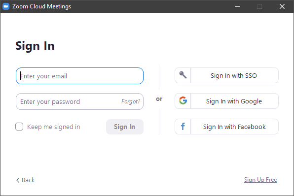 If you already have a Zoom account, enter your email and password to sign in. Alternatively, you can sign in using Google, Facebook, or other available options. If you're new to Zoom, click on the 'Sign Up Free' link at the bottom right to create a new account using your email address.