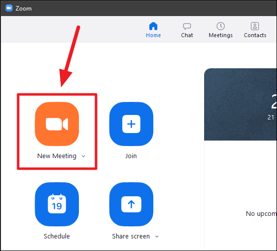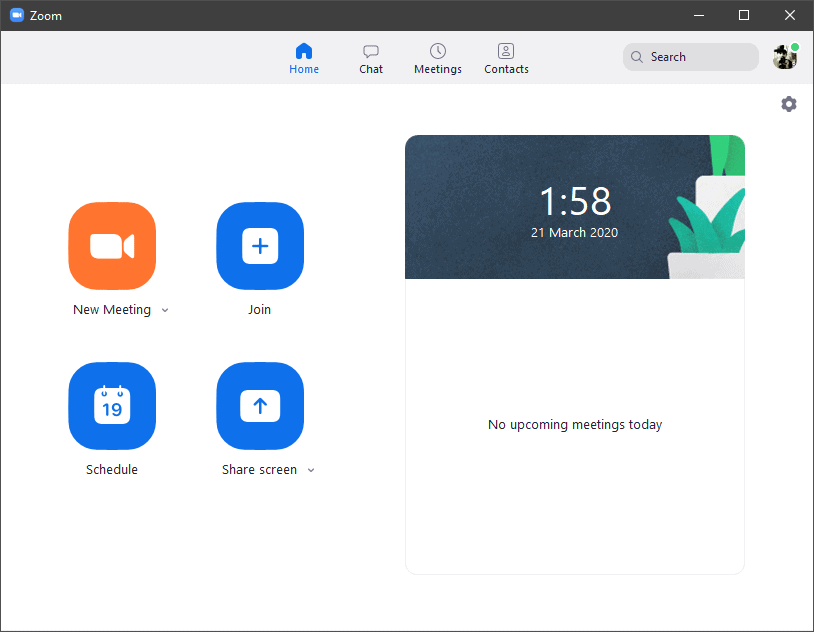 Once signed in, the Zoom dashboard appears, presenting options to start a 'New Meeting', 'Join' or 'Schedule' a meeting, and a 'Share Screen' option to share your screen with others.