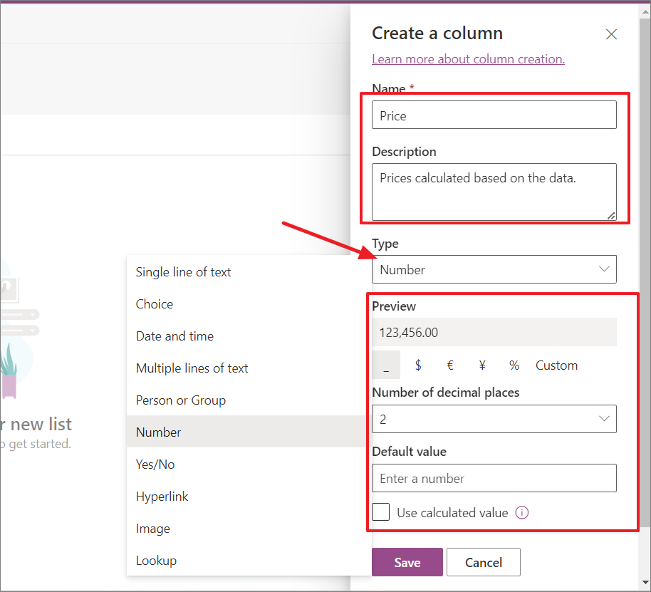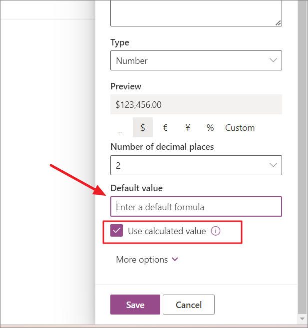 - Column types including Single line of text, Choice, Date and time, Multiple lines of text, and Number have the option to use a calculated value as the default value. To check this option, select the column type and then look for the 'Use calculated value' checkbox. If you enable this checkbox, you can then enter the formula you want to use to calculate the default value.
