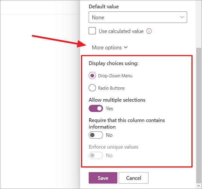 - Then, click the 'More options' menu at the bottom to see more options for defining the values that can be entered in the column, how it's displayed, etc. For example, when the column type is set to 'Choices', under More options, you can choose whether to display choices using a drop-down menu or radio buttons, allow multiple selections, and more.