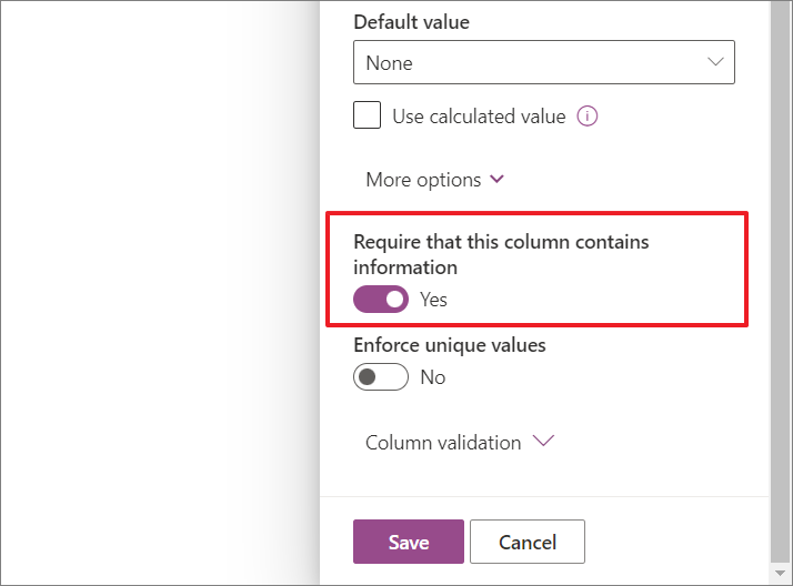 - Although the options under 'More options' differ for each column type, all column types have one common option: 'Require that this column contains information'. If you want to make this column a required field, turn on the 'Require that this column contains information toggle (Yes). This means if the field is left blank, it will show a message - "This field requires a value".