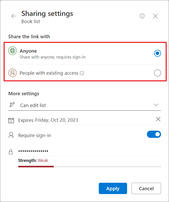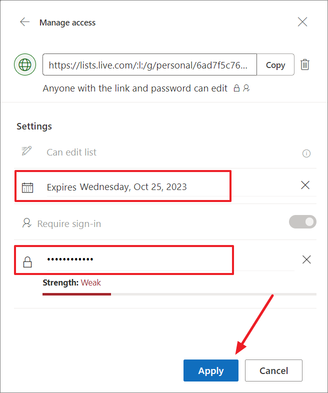 - You can also set an expiration date for the link to expire. After the expiry date, the link won't work and you'll need to create a new link or reshare with people so they can continue to access the list.