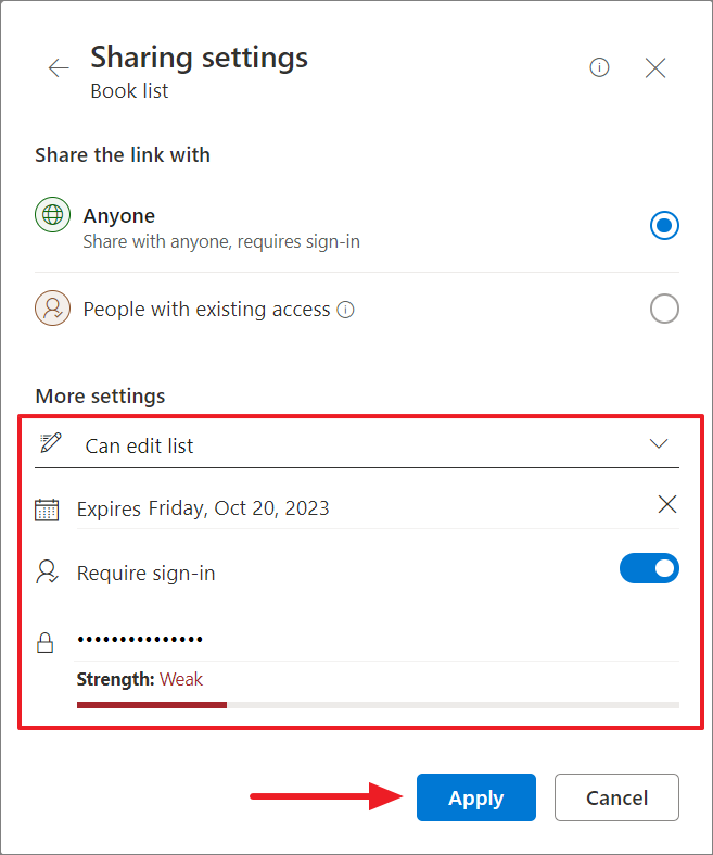 - If the list requires login, turn on the 'Require sign-in' toggle and enter a password in the password field.