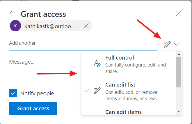 - To the right, click the pencil icon and change the person's permission level from the drop-down menu. Unlike with a share link, you can also give others full control over the list, including the ability to fully configure, edit, and share the list.