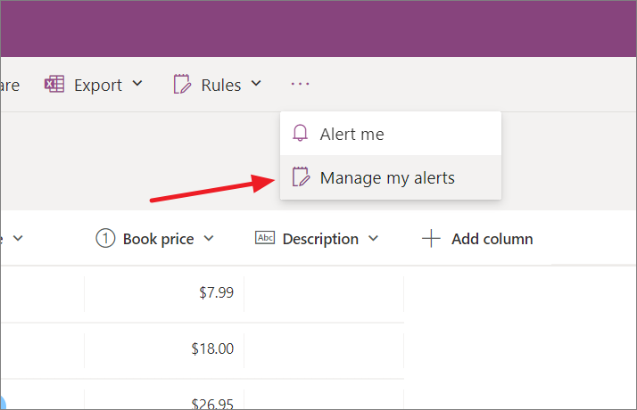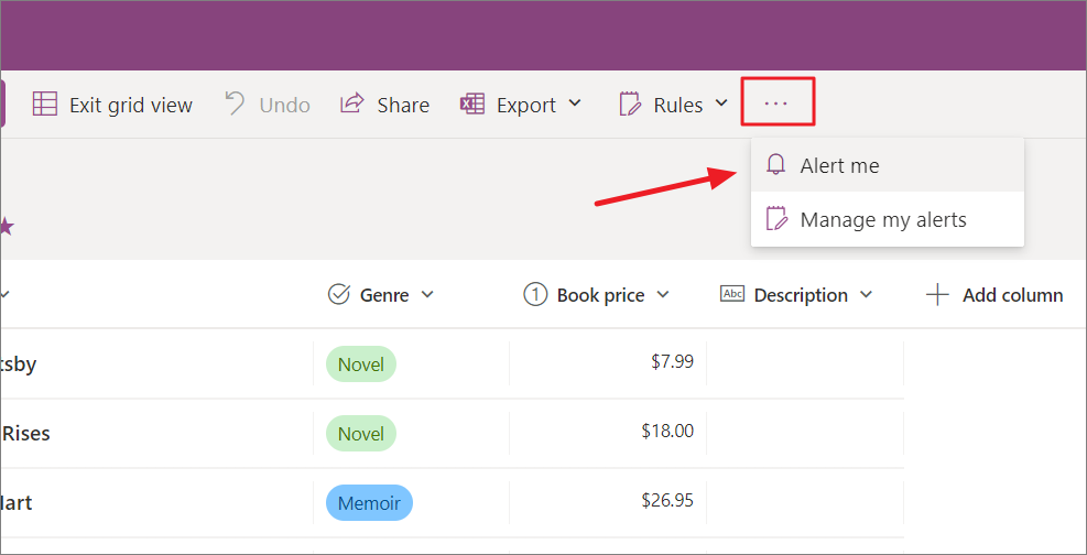 To set up an alert, go to the list you want to receive alerts for, click the three dots button, and select the 'Alert me' option.