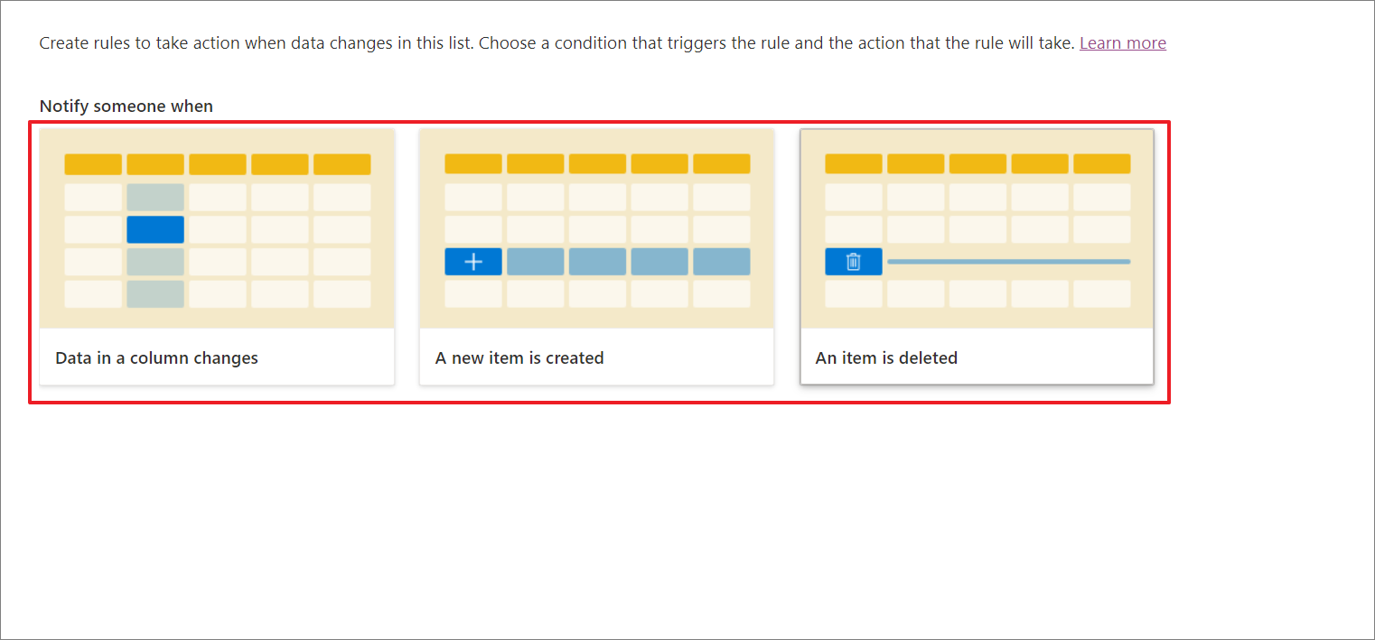 - In the window that appears, choose the condition that triggers the rule, such as when data changes in the column, an item is added, or an item is removed.