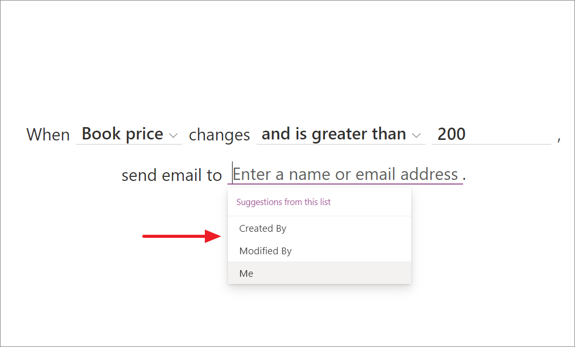- Once you have selected the condition, you can specify who should receive the email notification: the person who created the list, the person who last modified the list item, or yourself (the person who created the rule). You could also notify someone else by typing their name or email address in the field.