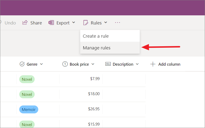 - To manage the rules, click the 'Rules' menu on the list page and select 'Manage rules'.