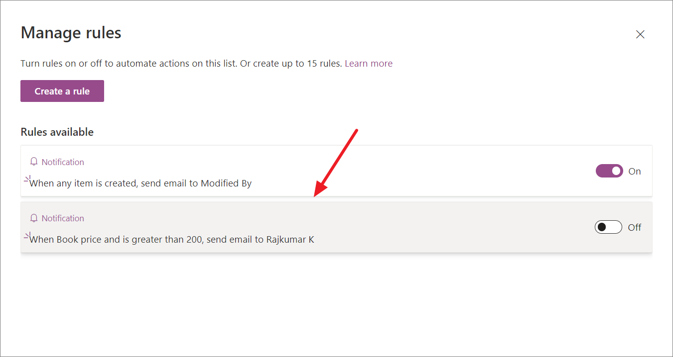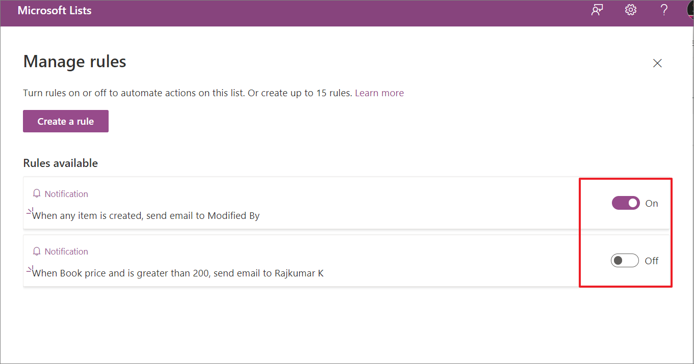 - To disable a rule, turn off the toggle next to the rule.