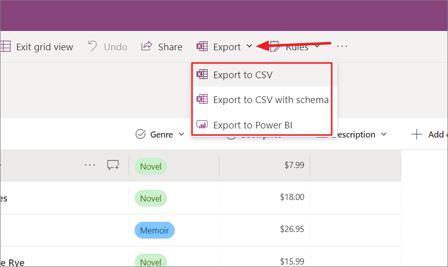 - Export to Power BI: This option allows you to save your list data to a Power BI dataset. Power BI is a business intelligence tool that allows you to create interactive reports and dashboards from your data.