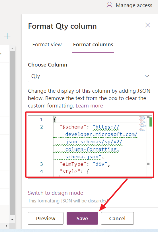 - In the JSON formatting box, enter the JSON code that you want to use to format the column.