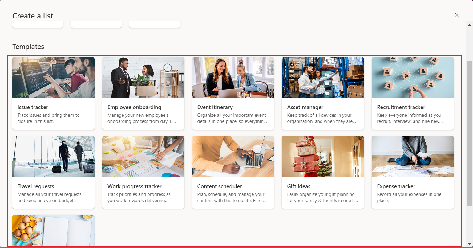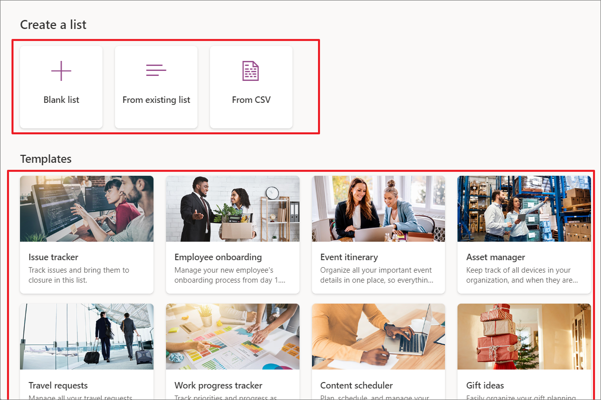 Another best way to create lists is through pre-built temples. As of now, Microsoft lists offers 11 different templates, such as issues tracker, employee onboarding, travel requests, etc.
