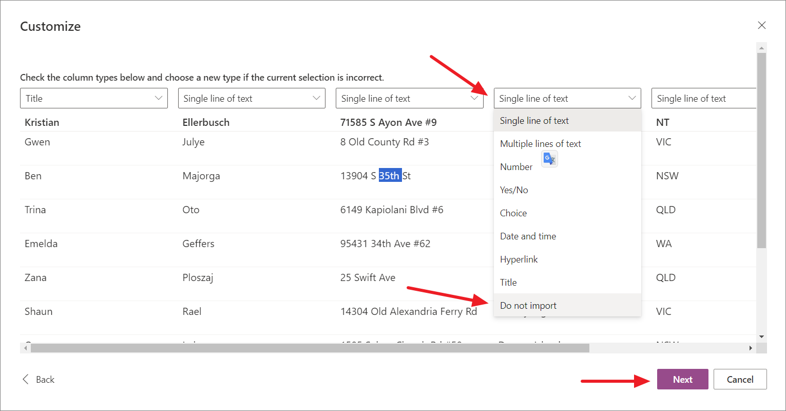 - Here, you can check the column data type and if it's incorrect, select a different type from the drop-down menu above each column. You can also choose not to import a particular column by selecting the 'Do not import' option. Once you're done, click 'Next'.