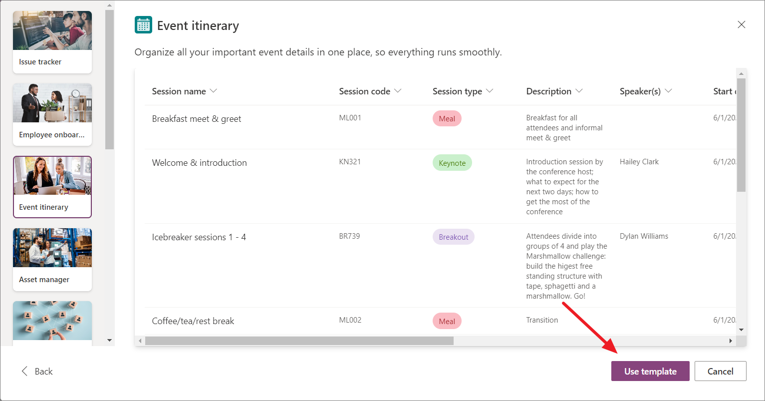 - You will then see a preview of the template. Click the 'Use template' button to create a list with the selected template.