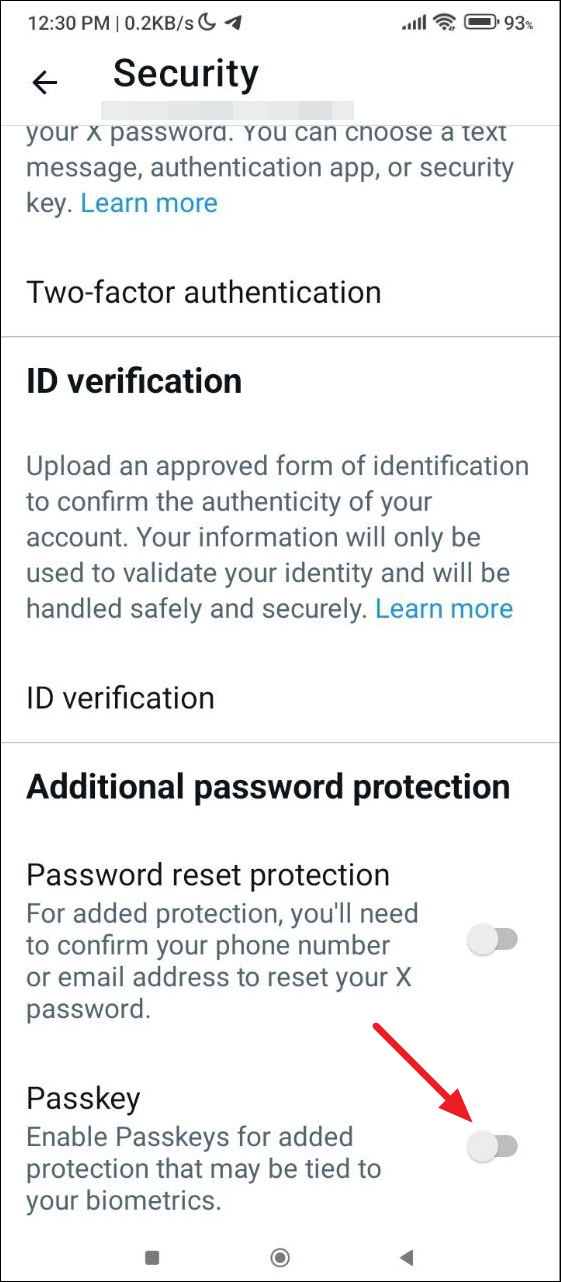 - Scroll down to the bottom of the Security page and tap on the toggle for the 'Passkey' option to turn it on.
