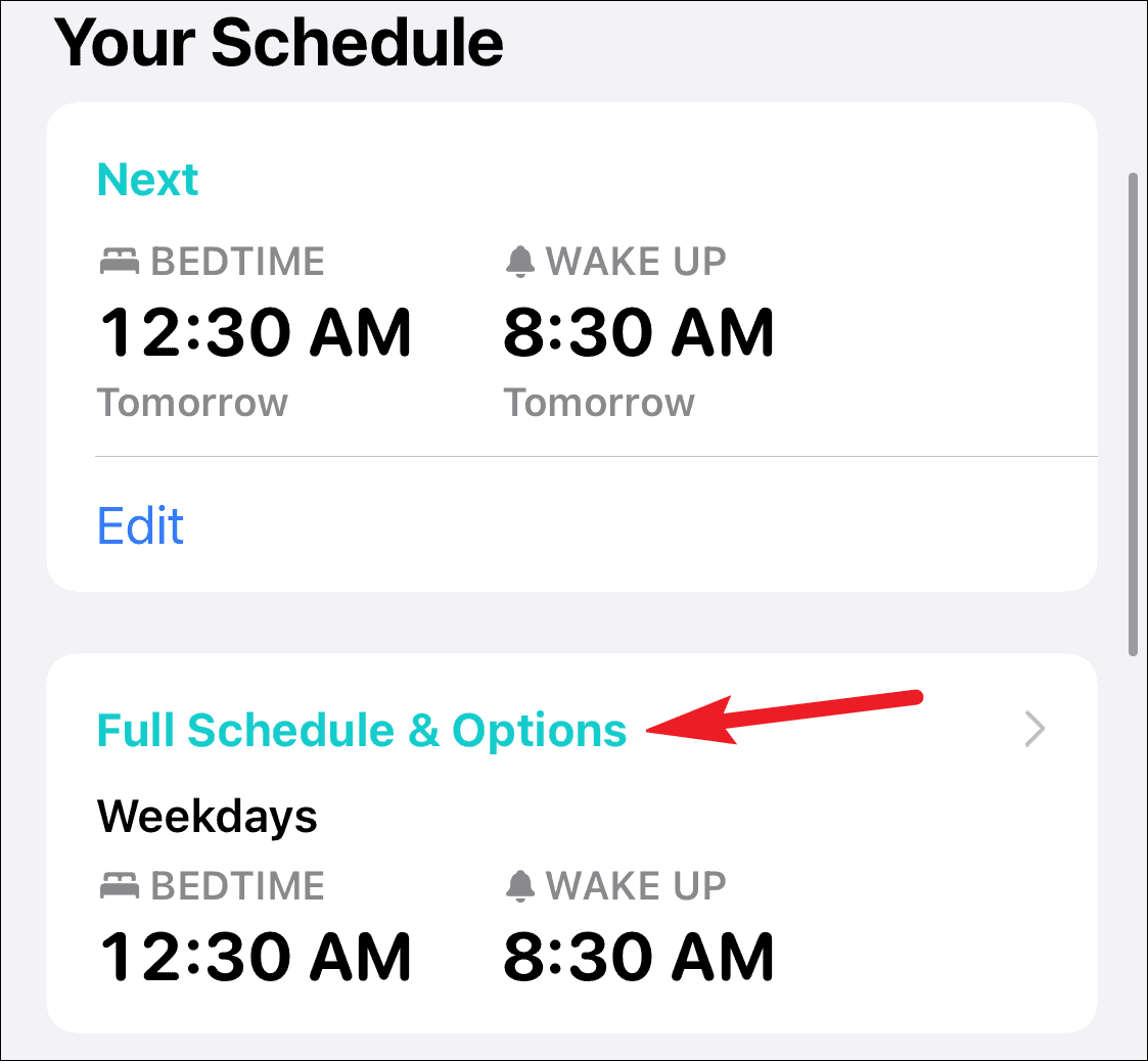 Go to Sleep settings in the Health app, and tap the option for ‘Full Schedule & Options’ under Your Schedule.