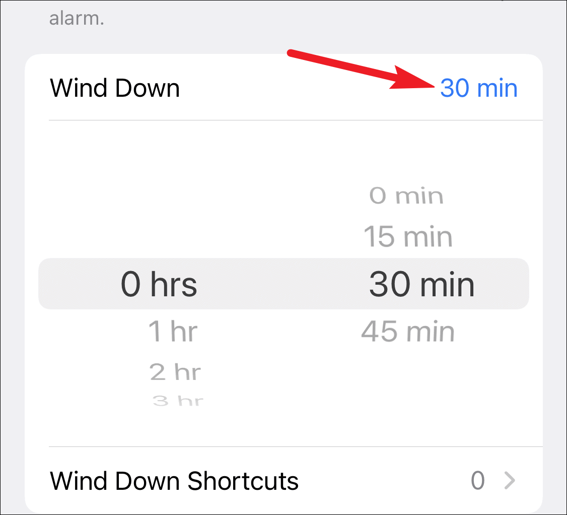 Then scroll down and tap on ‘Wind Down’ and select the time. If you choose 30 min and your bedtime is 11:30 PM, the wind-down will start at 11:00 PM. Essentially your phone will enter the Sleep Mode at 11 instead of 11:30.