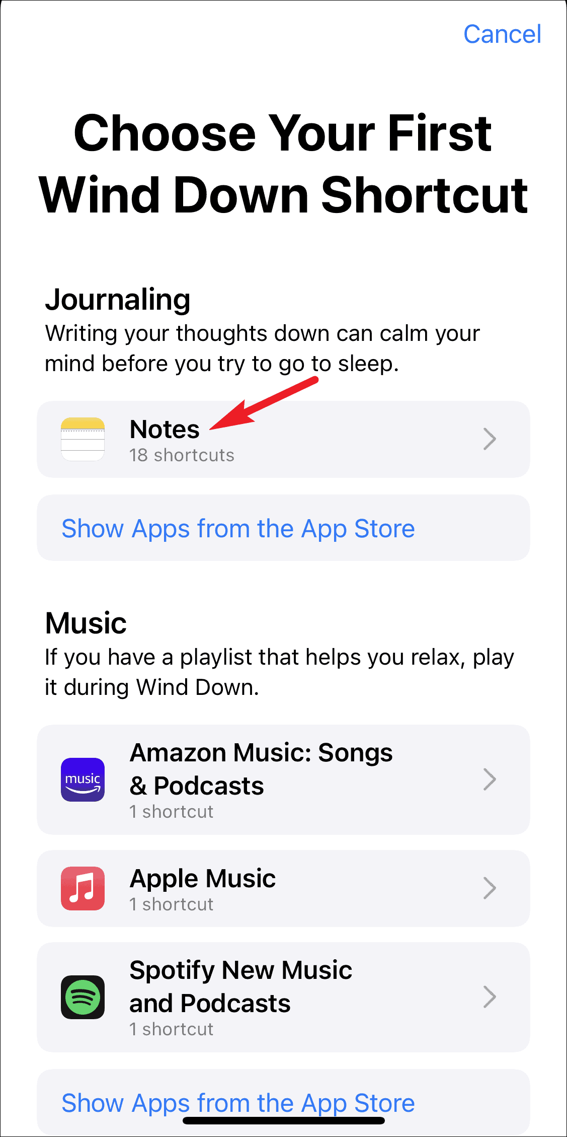 The Choose Your First Wind Down Shortcut screen will open. You can add shortcuts for journaling, music, podcasts, reading, mindfulness, or add any other app from App Library or App Store.