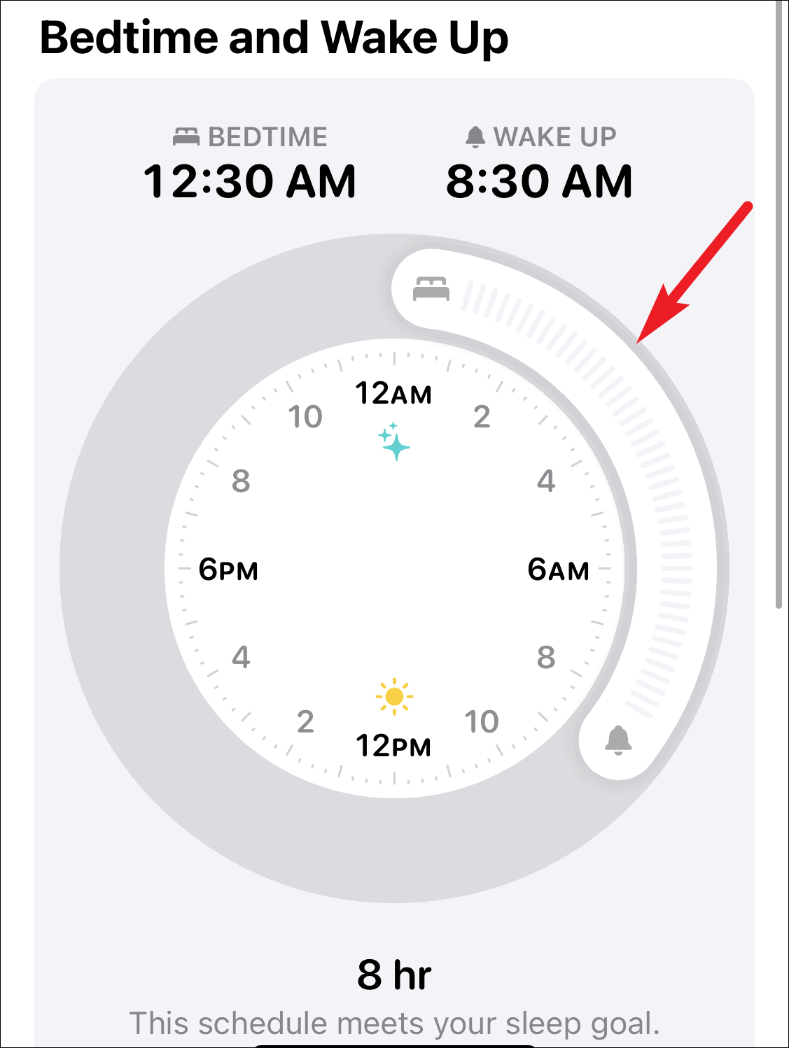 Now to adjust the schedule, drag the sleep block on the clock under the ‘Bedtime and Wake Up’ label. The ends of the block represent the timings for your Sleep and Wake up reminders.