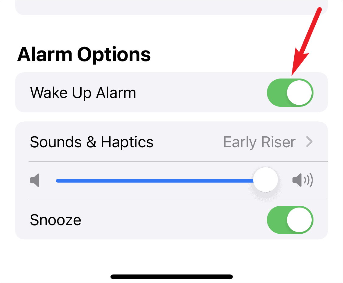 You can also configure a wake-up alarm for your schedule. Scroll down to reveal the options for the alarm. To turn on the alarm that matches your Wake Up schedule, turn on the toggle for ‘Wake Up Alarm’. After turning on the toggle, you can also configure the Sounds & Haptics, volume, and snooze options for the alarm.