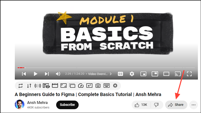 - In the pop-up, click on the 'Start at' checkbox that displays the time at which you have paused the video, and then click on the 'Share' button. You can also edit the time at which the video starts by clicking on it.