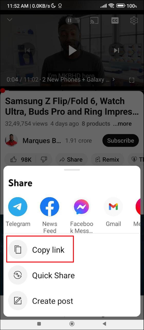 - Tap on the 'Share' button below the video and then on the 'Copy Link' option in the pop-up that appears.