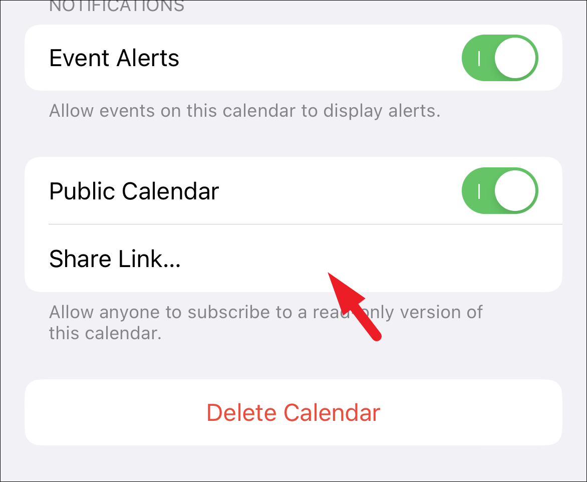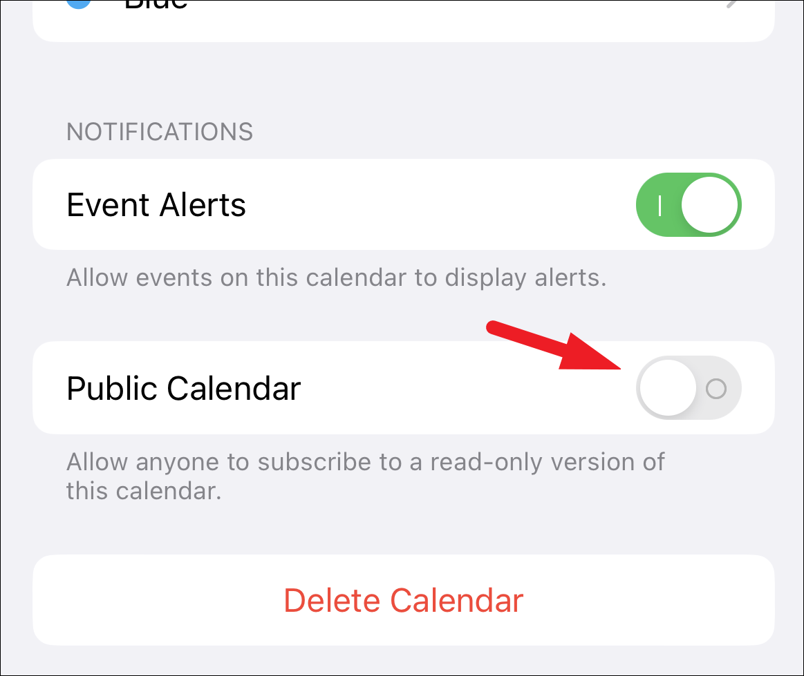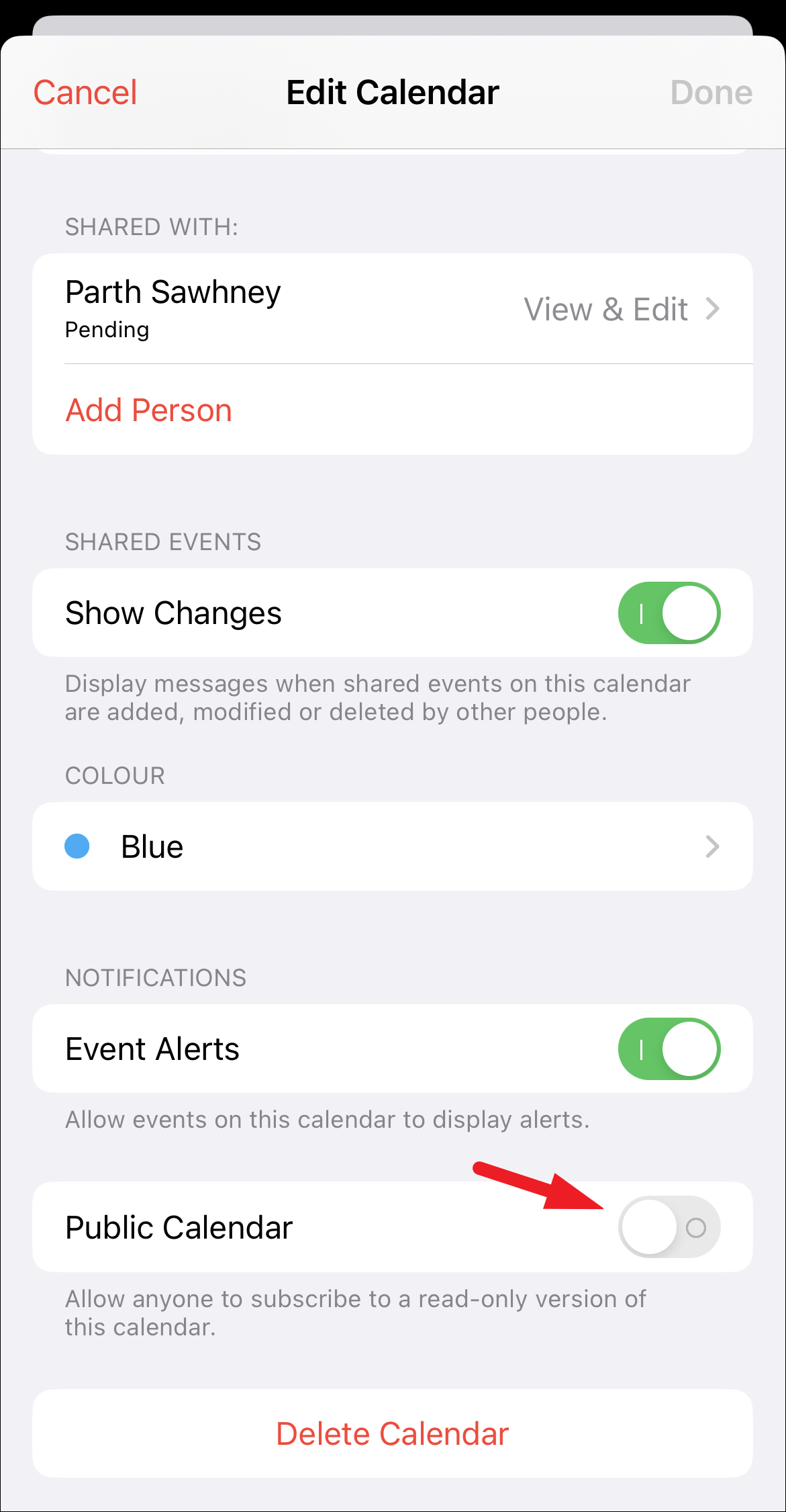 If you wish to make a calendar public in order to share it with people who do not have an iCloud account, tap on the toggle following the ‘Public Calendar’ option to turn it on.
