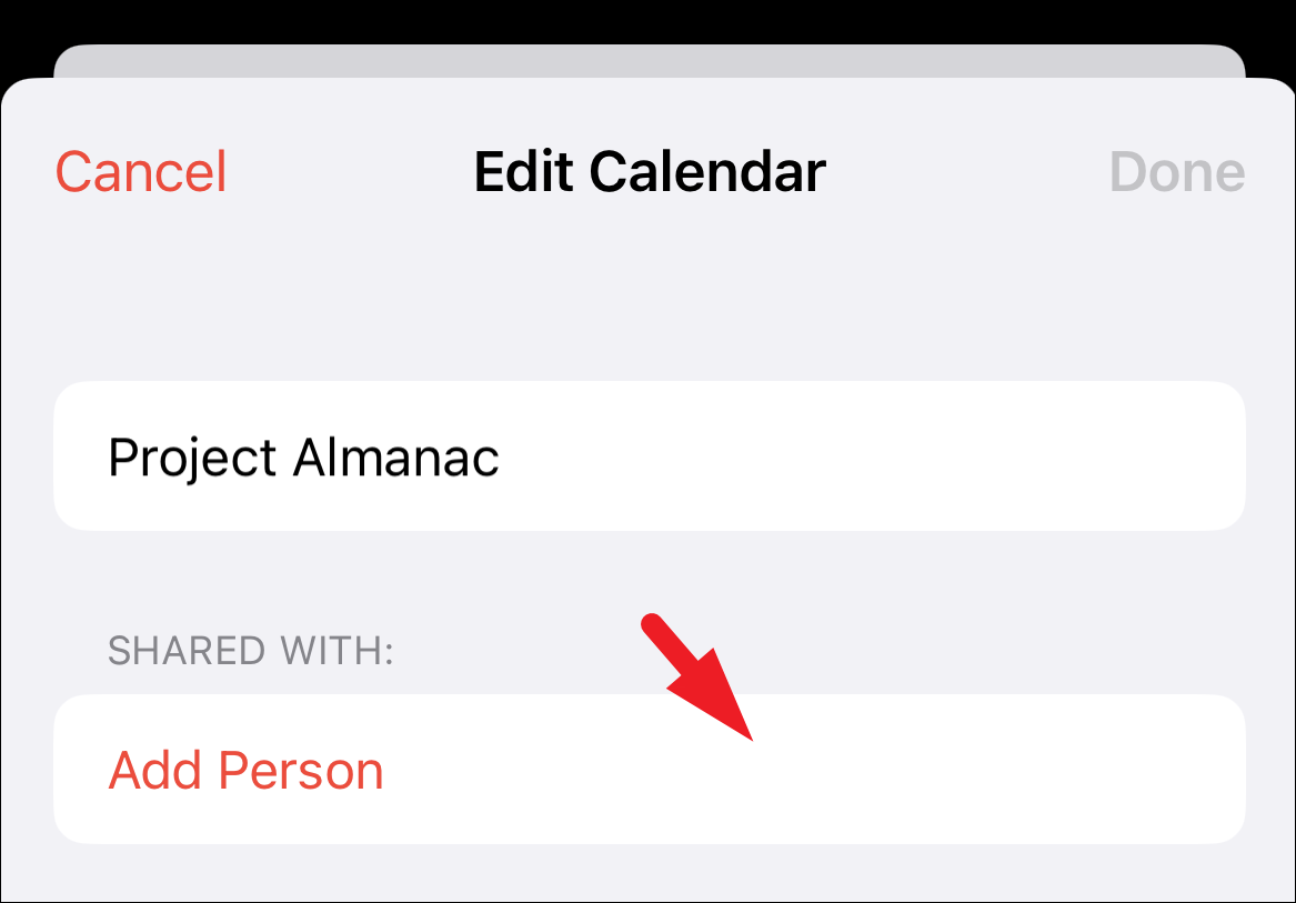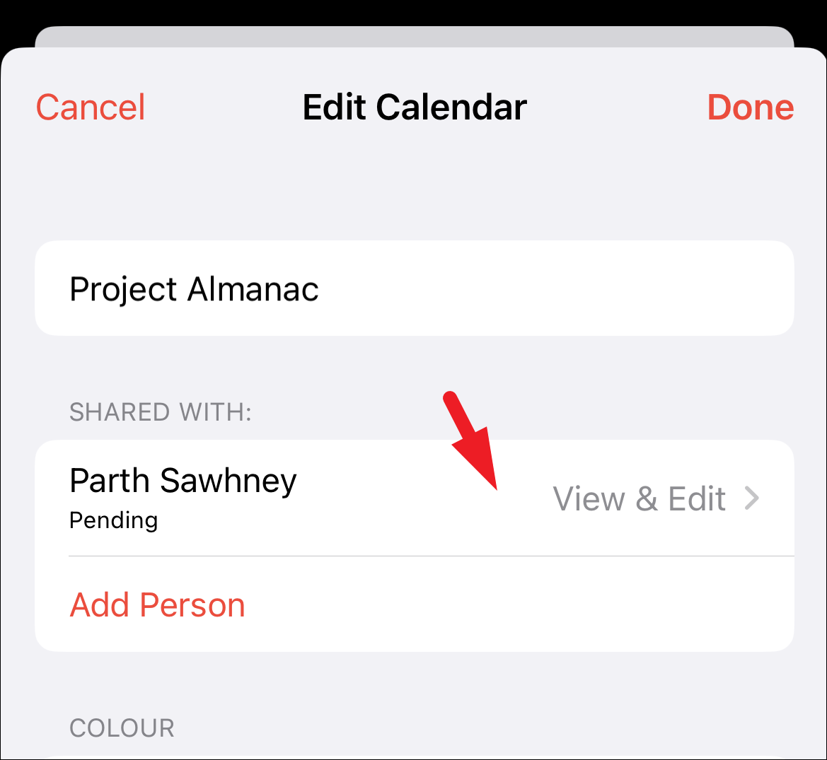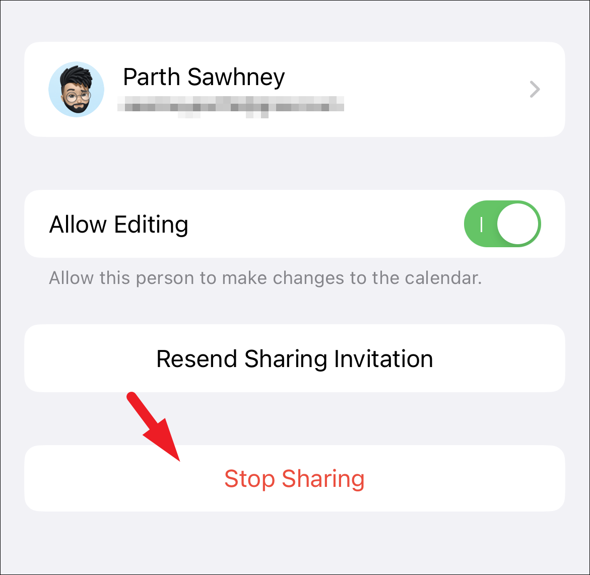 If you wish to stop sharing the calendar with a person, from the ‘Edit Calendar’ screen, tap on the person’s name you wish to stop sharing.