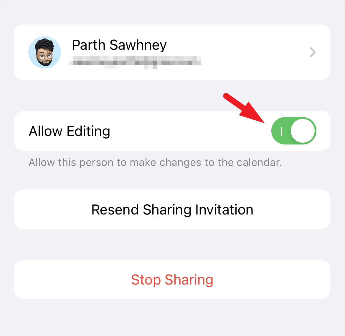 After that, tap on the toggle switch following the ‘Allow Editing’ option. When disabled the person will only be able to read the events.