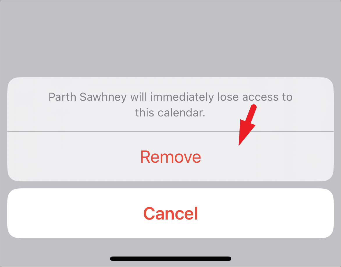 Now, tap on the ‘Remove’ option to stop sharing the calendar immediately.
