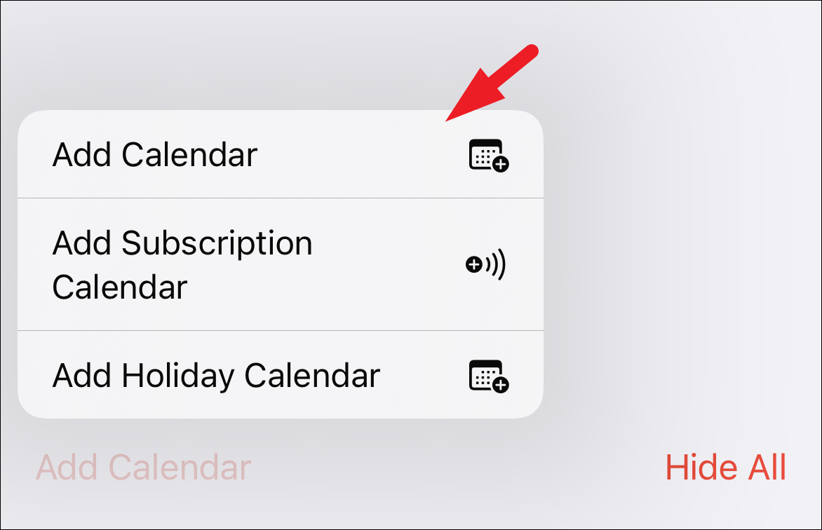Next, tap on the ‘Add Calendar’ option from the context menu. This will again bring an overlay pane to your screen.
