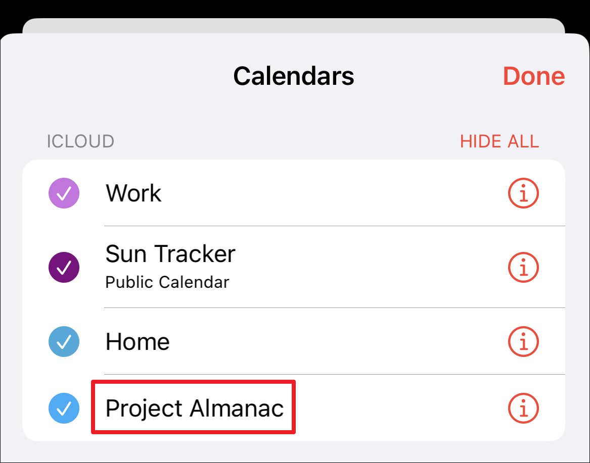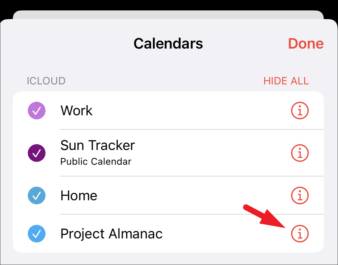 Next, tap on the ‘i’ button following the calendar you wish to share from the list. This will bring an overlay pane to your screen.