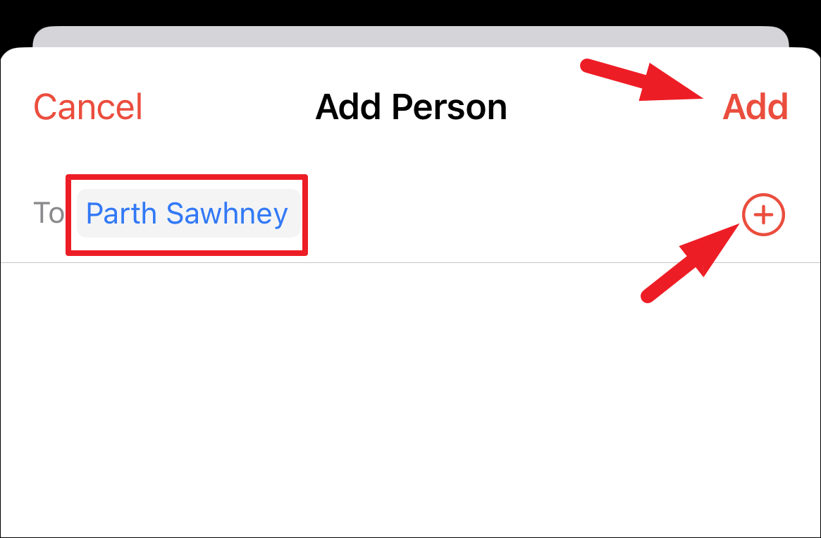 Now, from the overlay window, type the email address of the person you wish to share the calendar with. Otherwise, you can also tap on the ‘+’ button to add people from your contacts. Once you have added all the people you wish to share it with, then tap on the ‘Add’ button to send them an invitation. The other person will have to accept your invite to be added to the calendar.