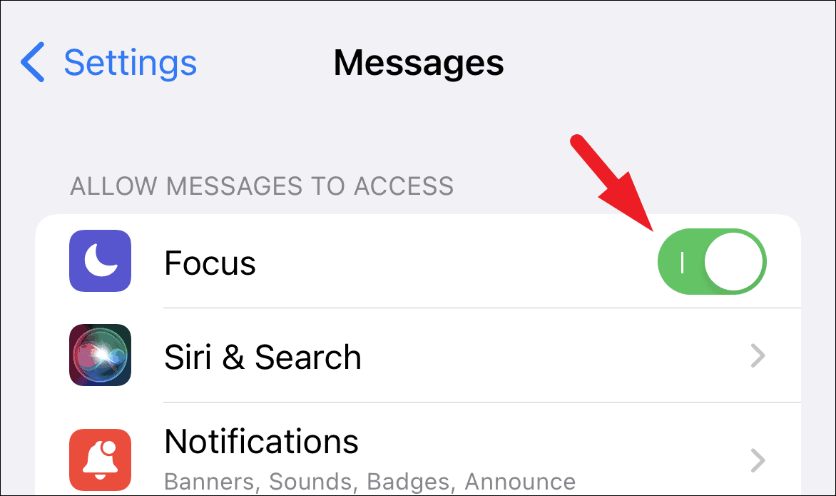 Next, from the ‘Allow <app> to access’ section, locate the ‘Focus’ option and tap on the following switch to bring it to the ‘On’ position.