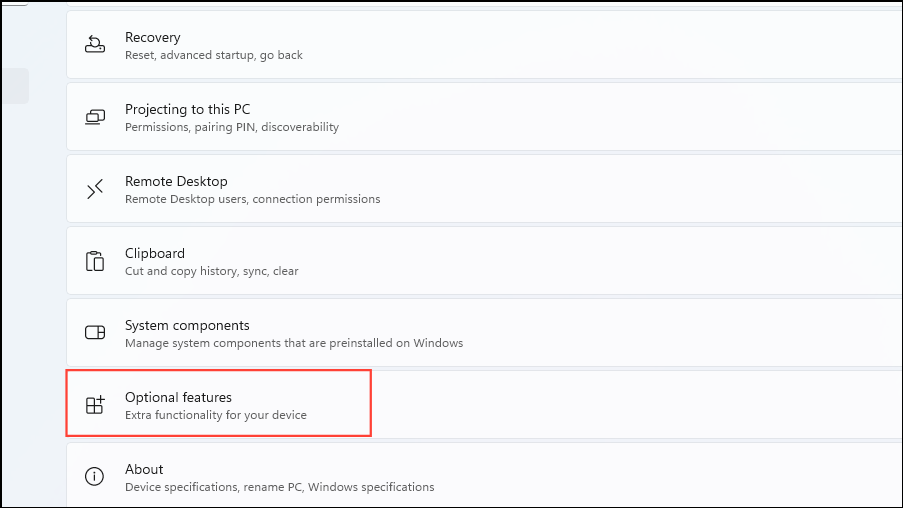 Step 1: Enable the Wireless Display feature on your Windows PC. Go to Settings (Win + I) > System> Optional features.
