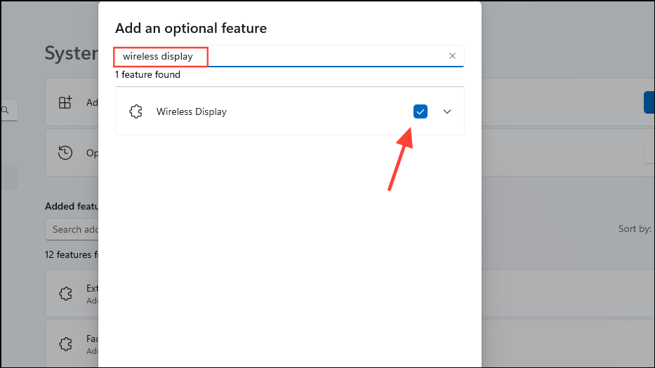 Step 2: Click "Add an optional feature," search for "Wireless Display," select it, and click "Install."