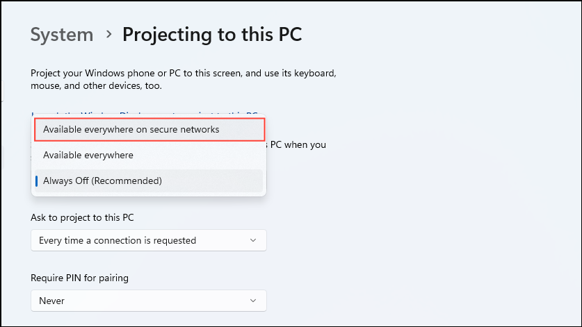 Step 3: Once installed, navigate to Settings > System > Projecting to this PC. Set the option "Available everywhere on secure networks" to allow Miracast connections.