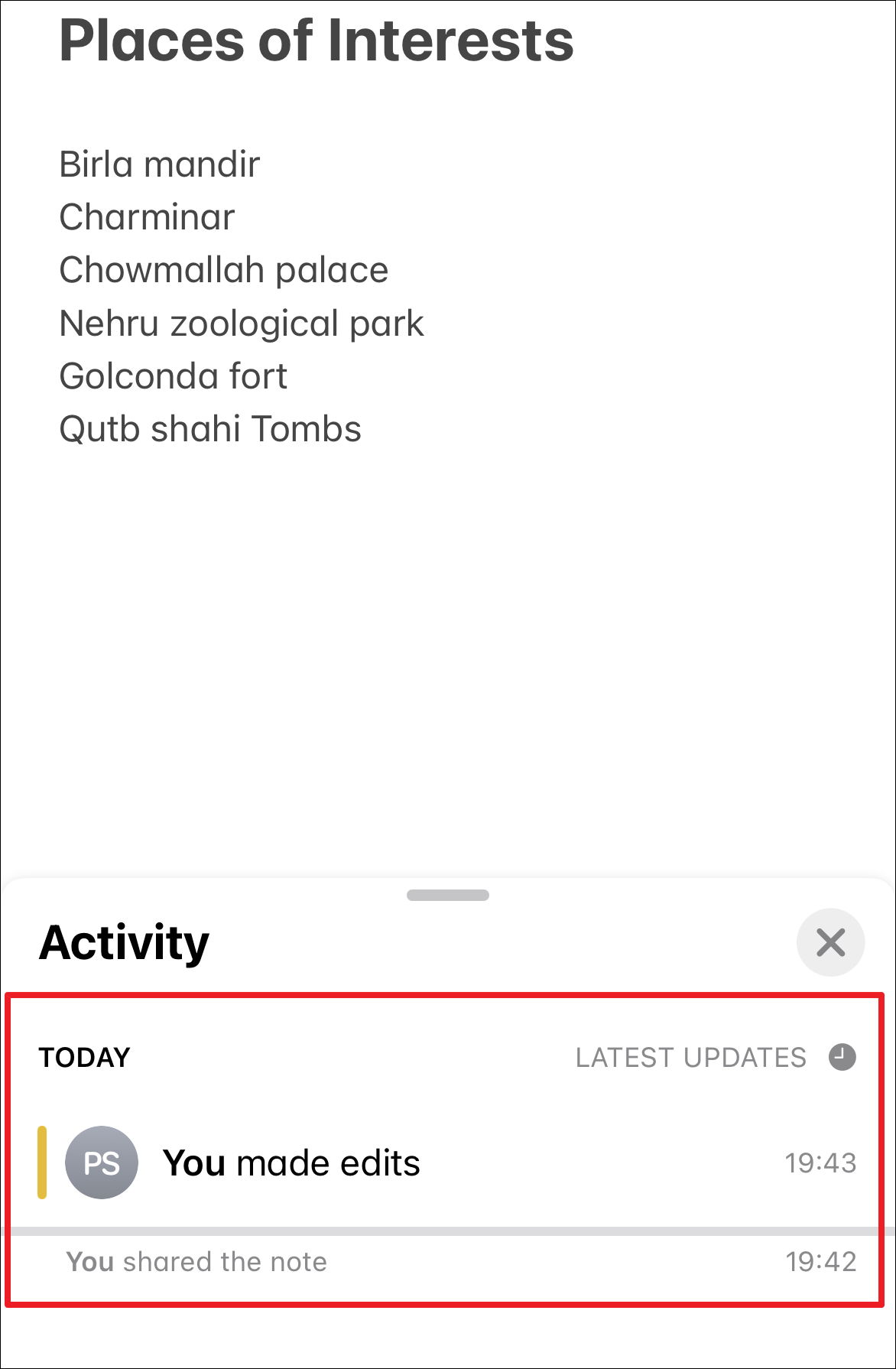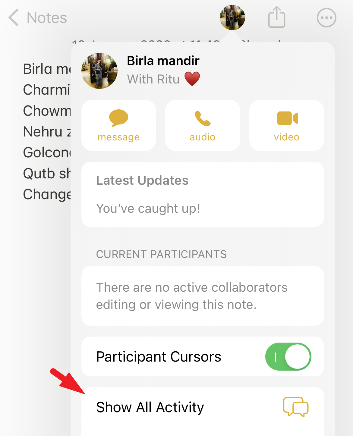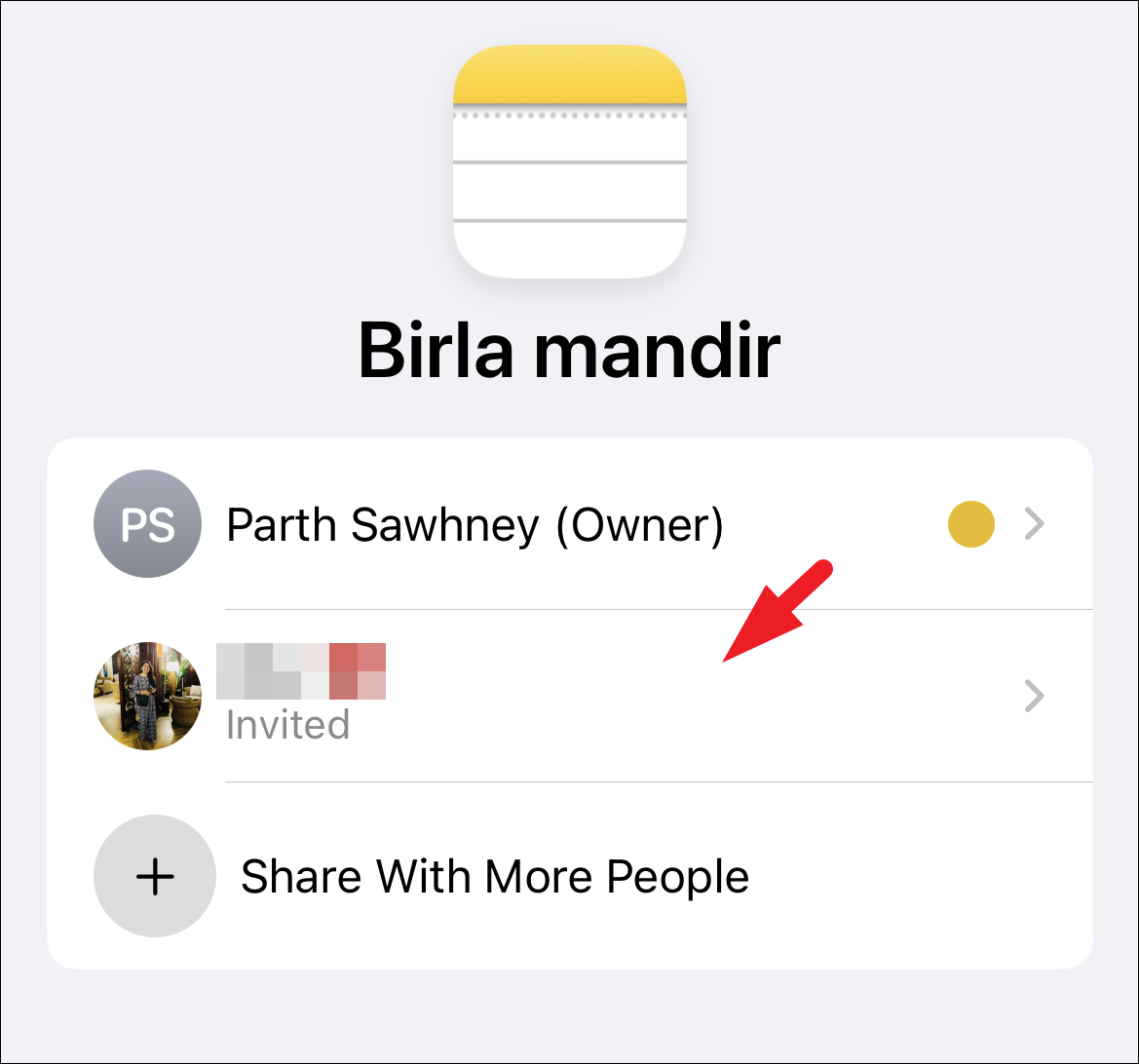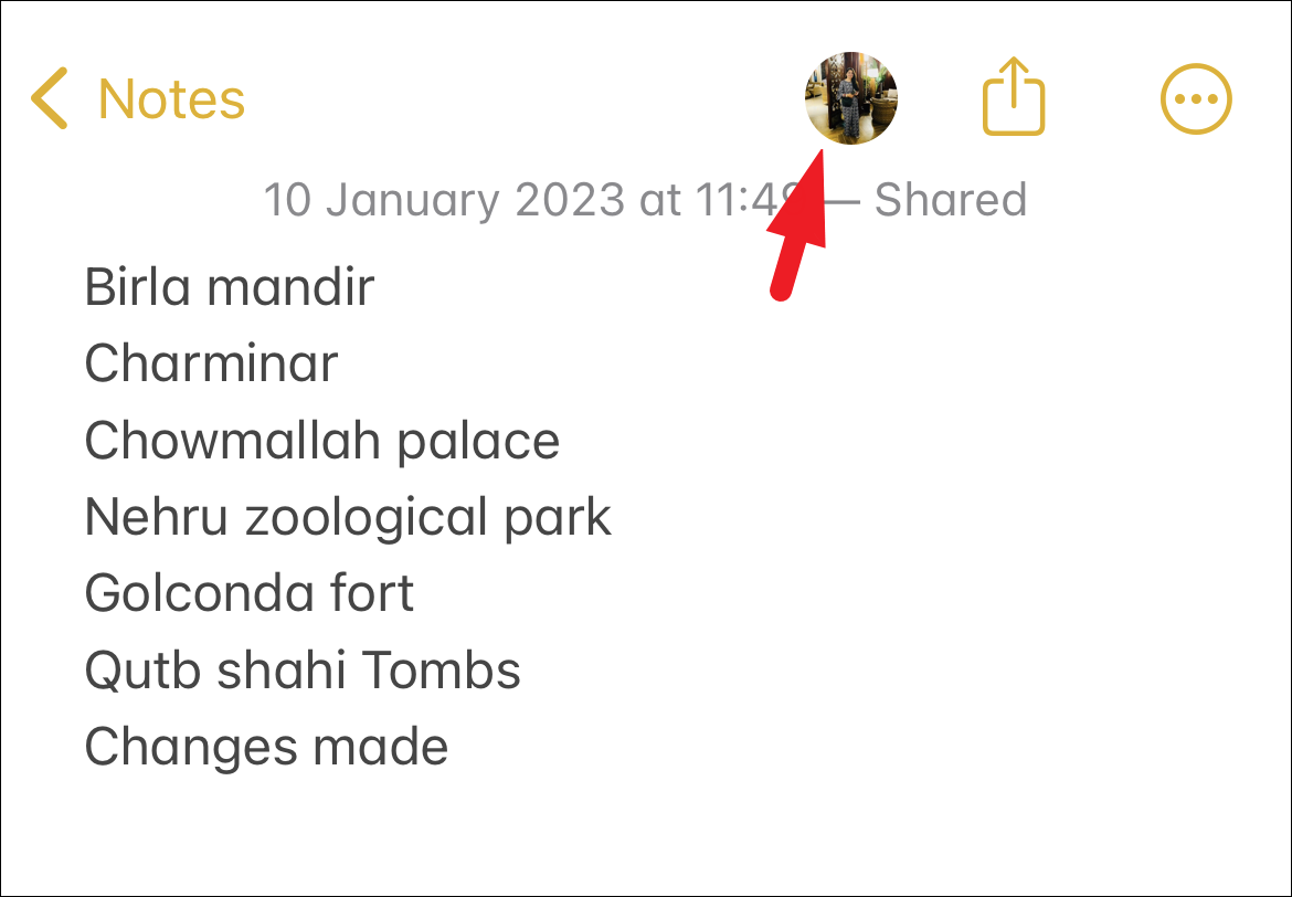 To view the activity, head to the shared note from the Notes app. Then, tap on the ‘Shared’ icon on the top to proceed. This will bring an overlay menu to your screen.