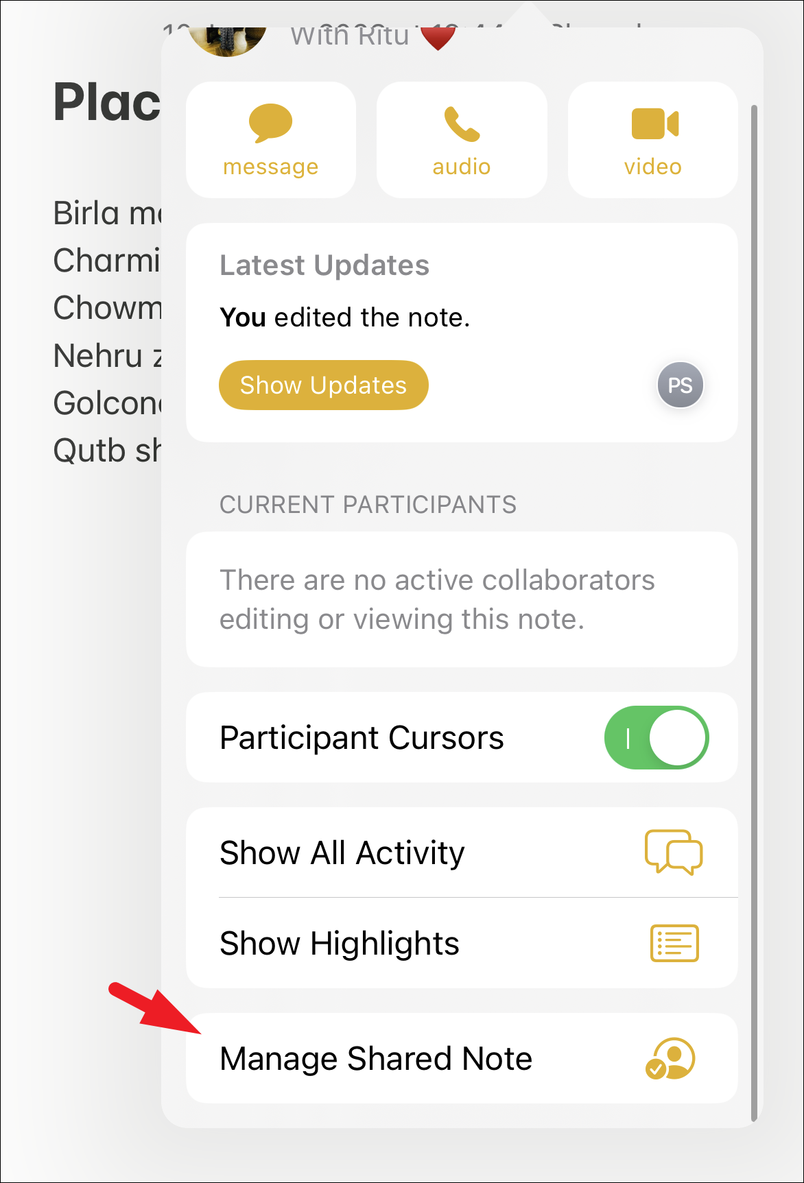 After that, tap on the ‘Manage Shared Note’ option from the list.