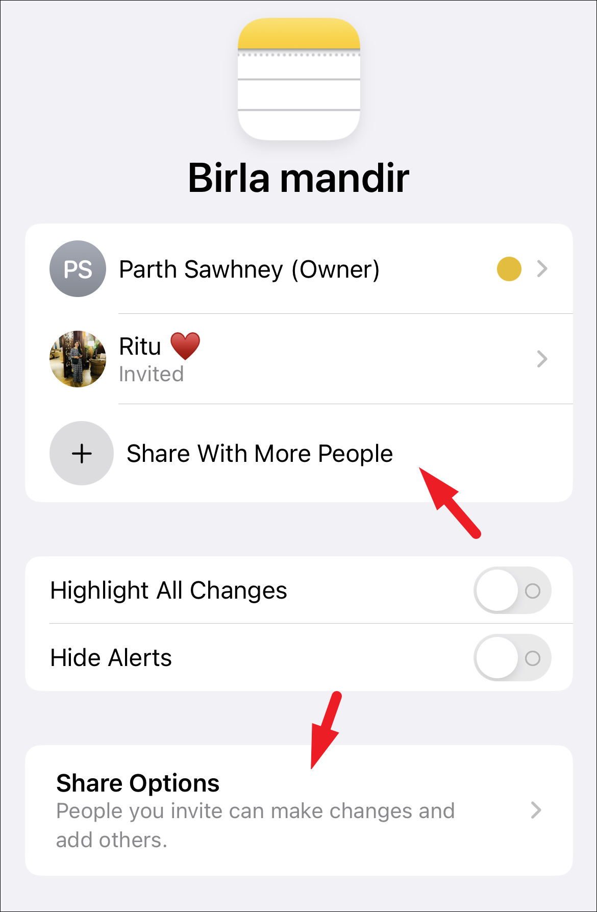 Now, to add more people, tap on the ‘Share with More People’ option. If you wish to change the access level for all the participants, tap on the ‘Share Options’ tab.
