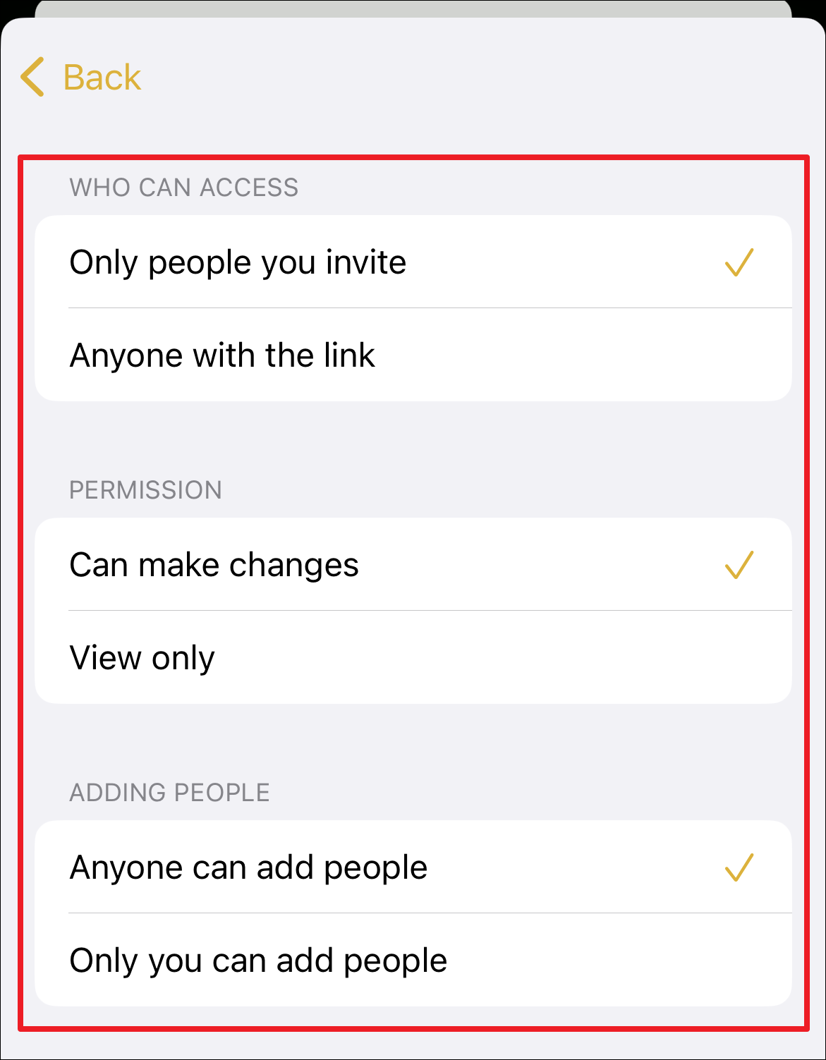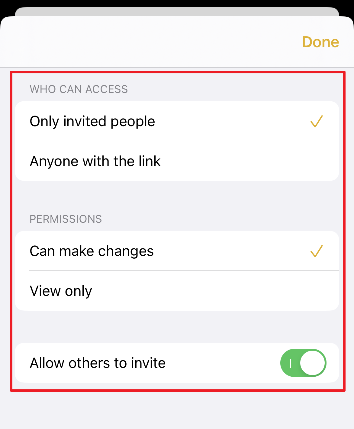 After that, tap on the ‘Only invited people can edit’ option to configure permissions and access.