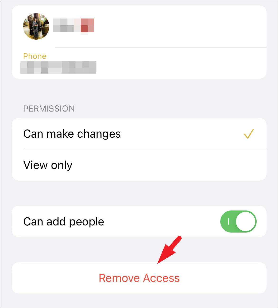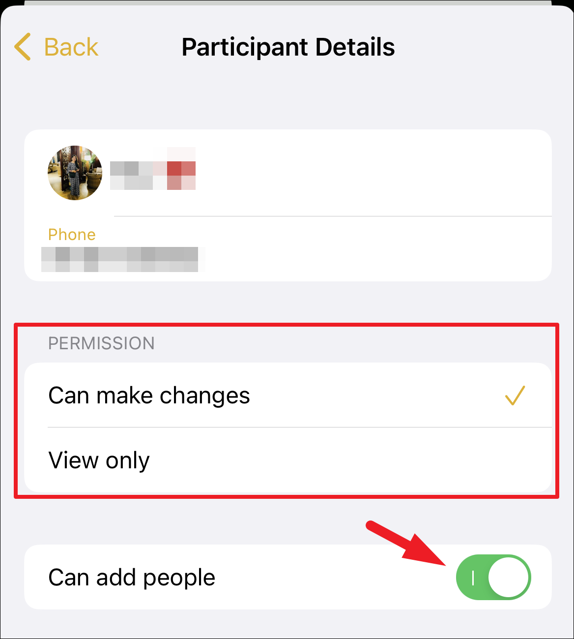 After that, configure the permission for the individual by tapping on the desired option. If you do not wish to allow the person to add more people, tap on the switch following the ‘Can add people’ option and bring it to the ‘Off’ position.