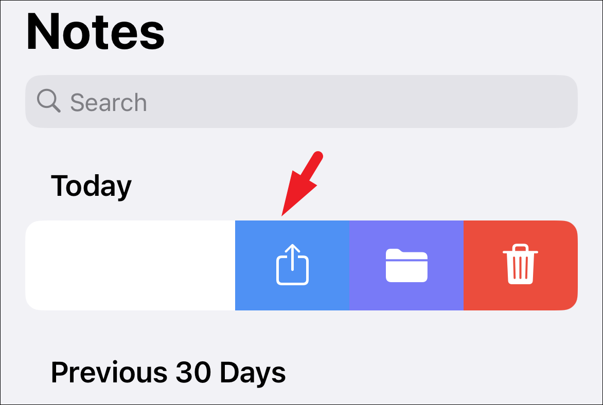 To share a copy of the note, from the Notes app, swipe right to left on the note and tap on the ‘Share’ button.