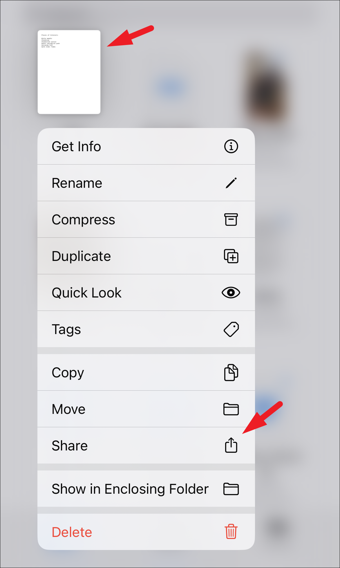 Now, head to the Files app and long-press on the file to open the context menu. Then, tap on the ‘Share’ option from the list and share the file using your desired platform.