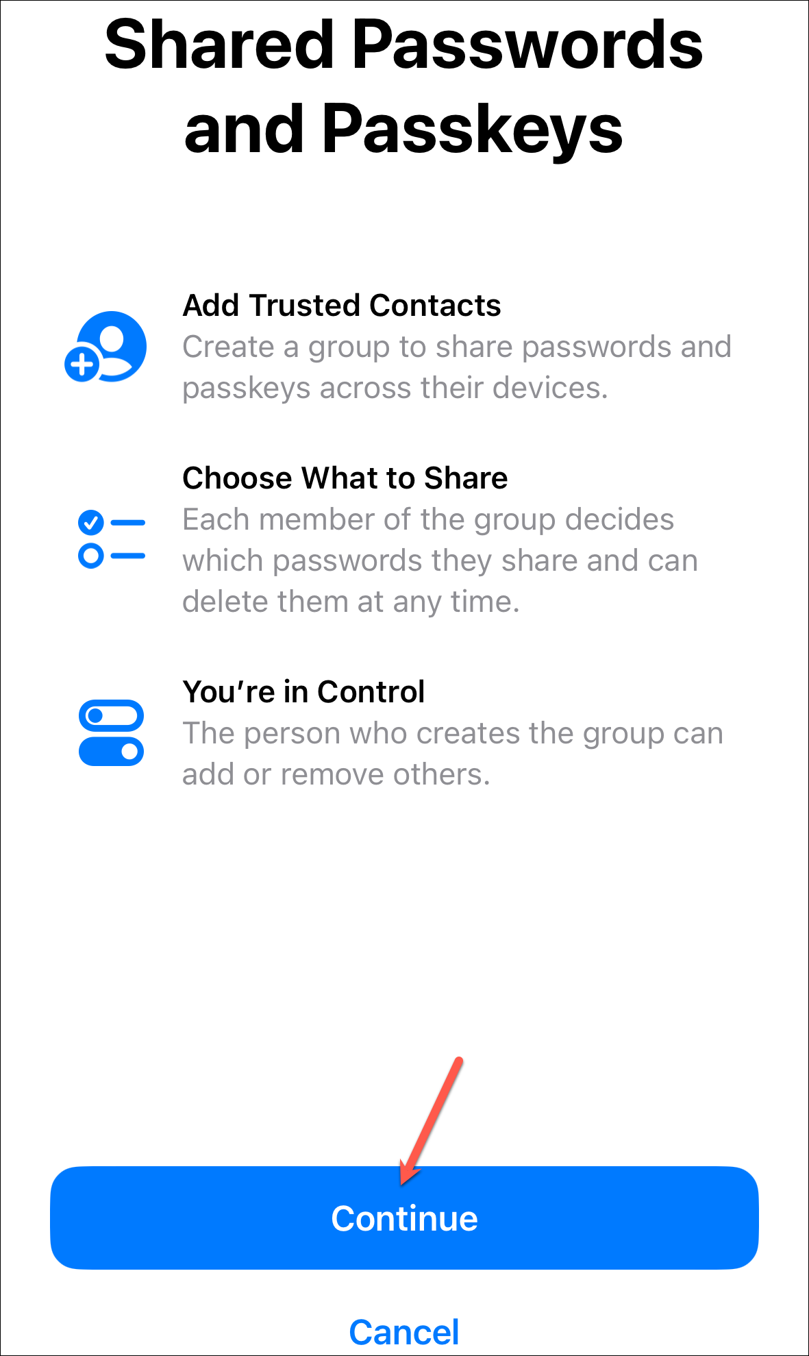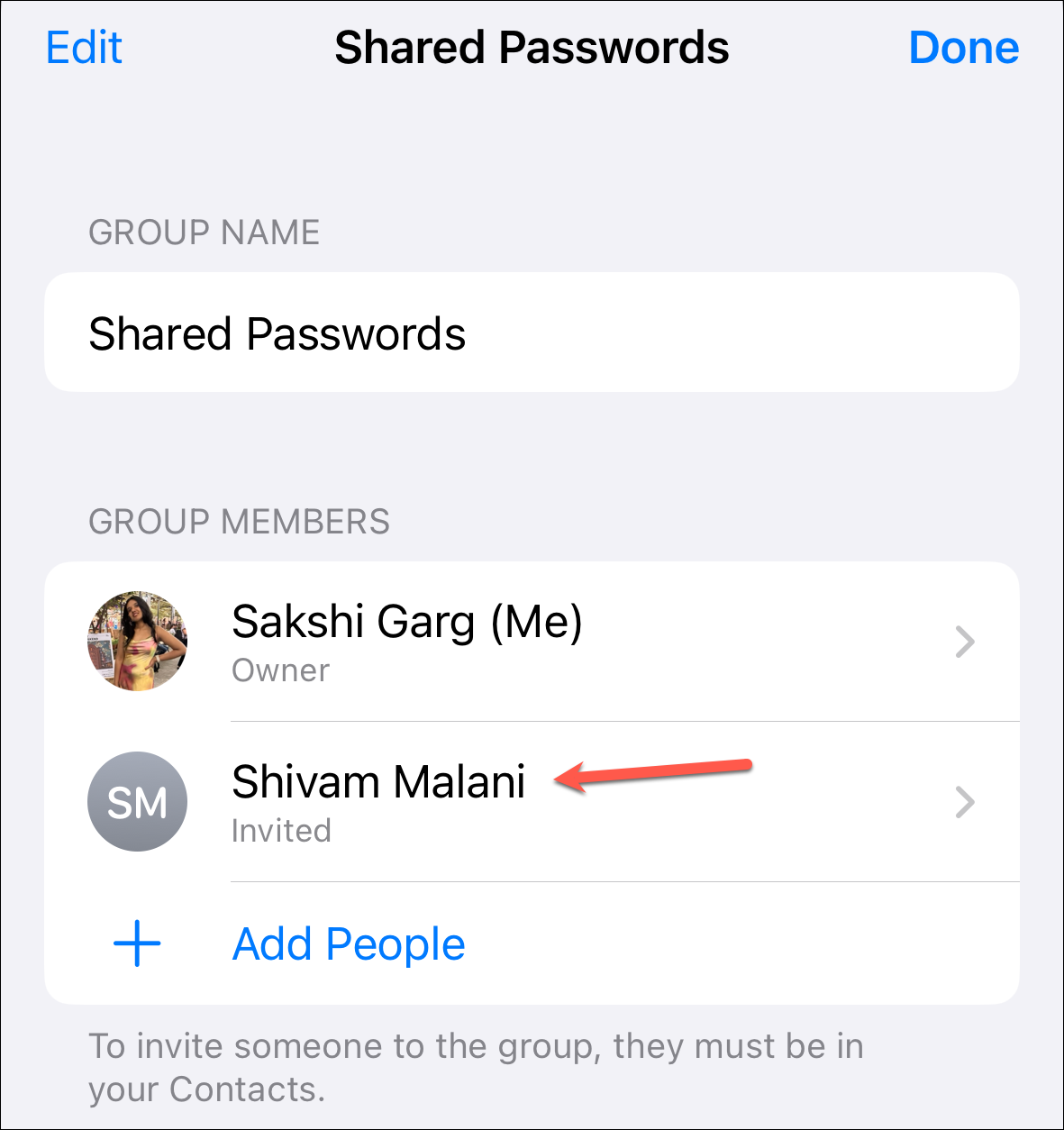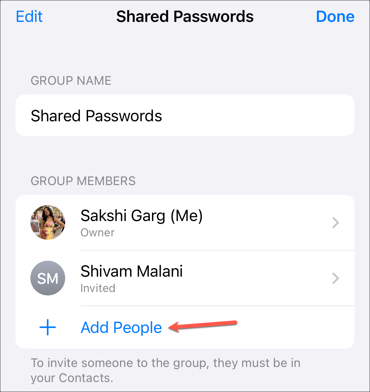 With password sharing, you can add your trusted contacts to a group and share passwords and passkeys with them. Moreover, anyone in the group can add or edit passwords. Although group members can add or edit passwords, only the group owner can remove passwords added by others.