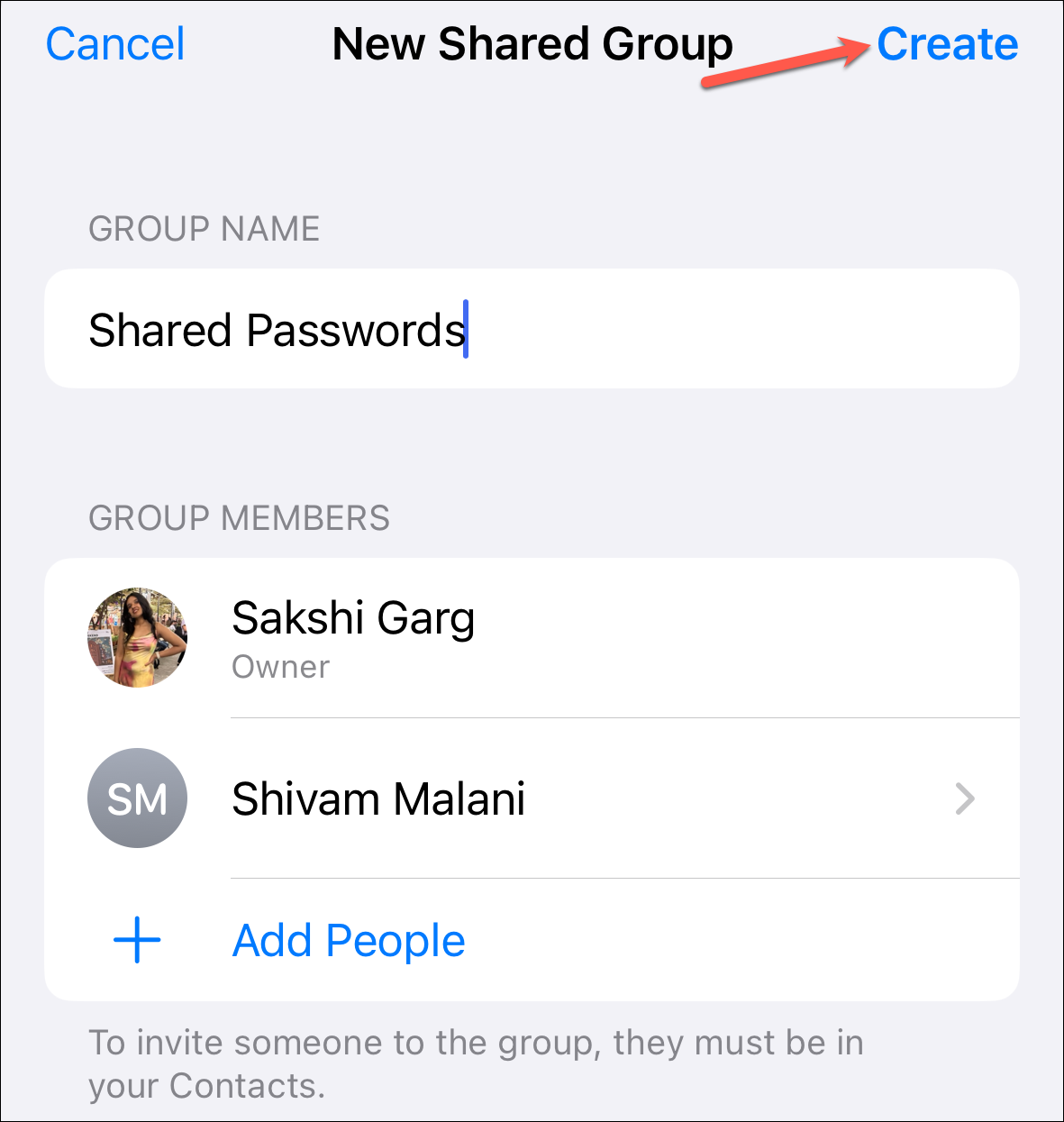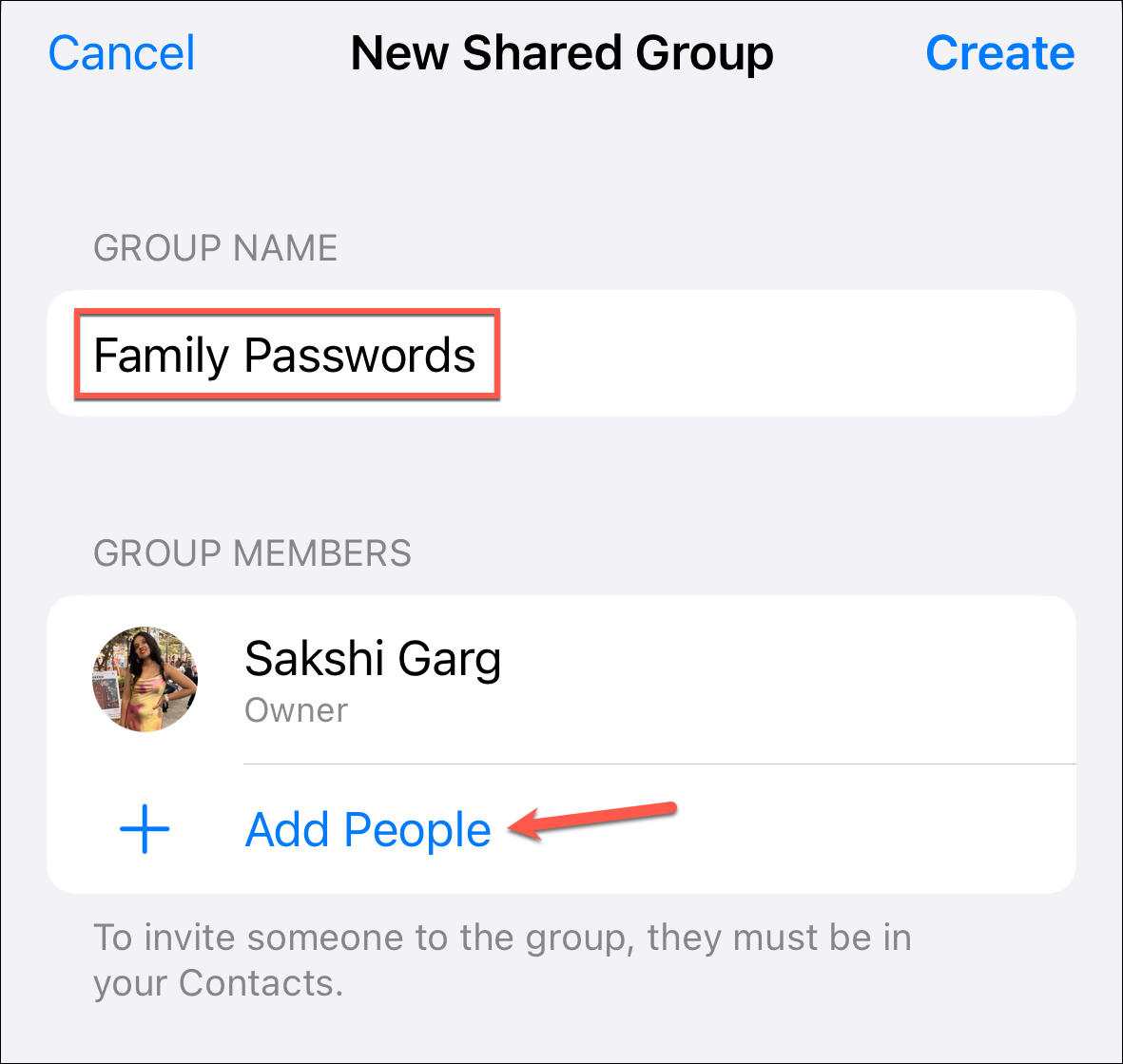 Next, enter a name for the group. By default, the name 'Family passwords' might appear pre-entered. You can edit it or keep it as it is. Now, tap the 'Add People' option to add participants to your little group.