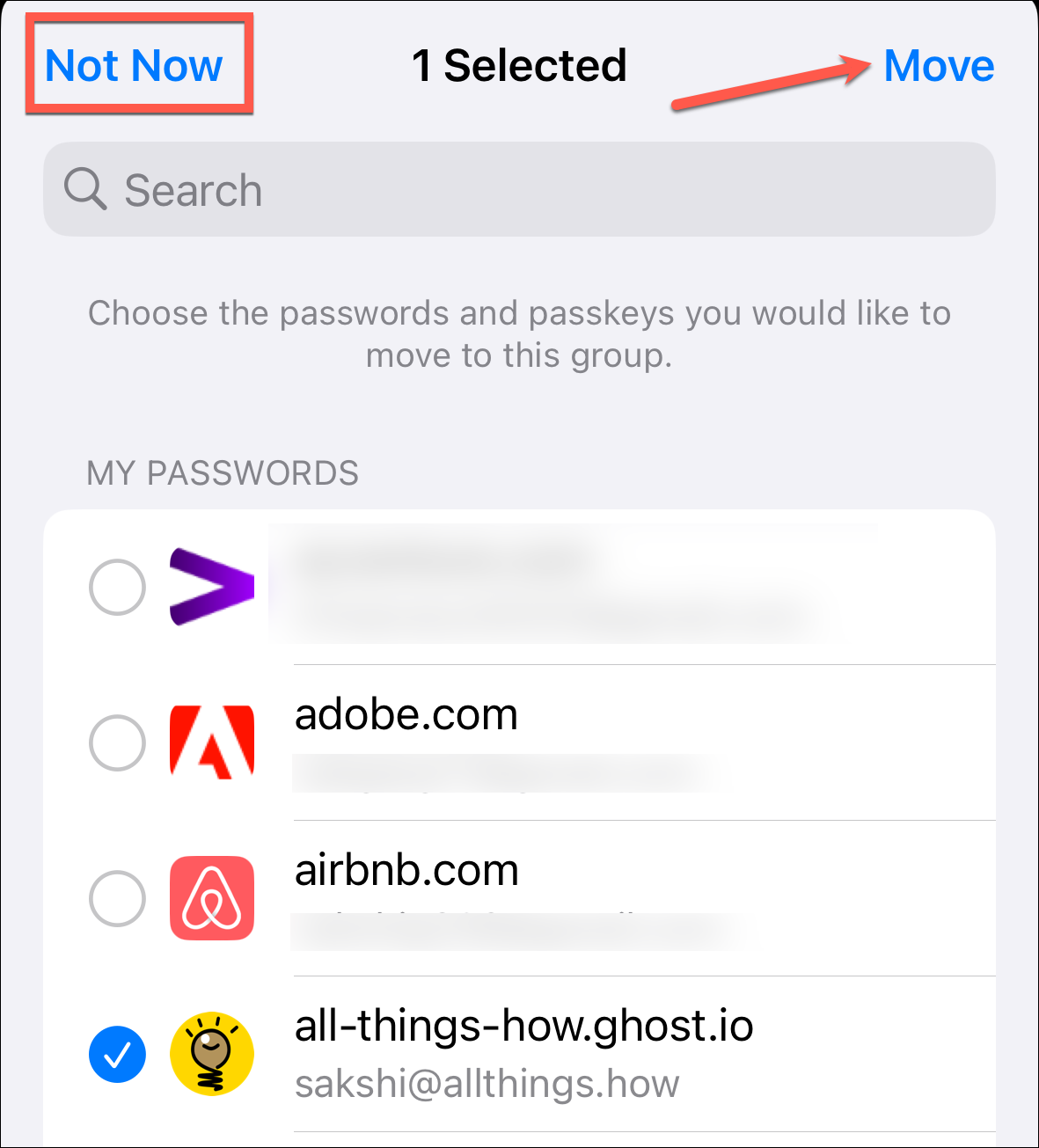 Next, choose the passwords or passkeys you want to share in the group and tap the 'Move' option. You can also tap 'Not Now' and add passwords or passkeys later.